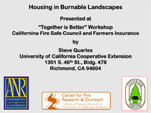 - Steve Quarles, Center for Fire Research and Outreach, College of Natural Resources, UC Berkeley, has done extensive research on the causes for homes igniting in burnable landscapes. This presentation includes many of the conditions that can lead to homes igniting and ways to avoid this happening through modifications that can be made to existing construction.